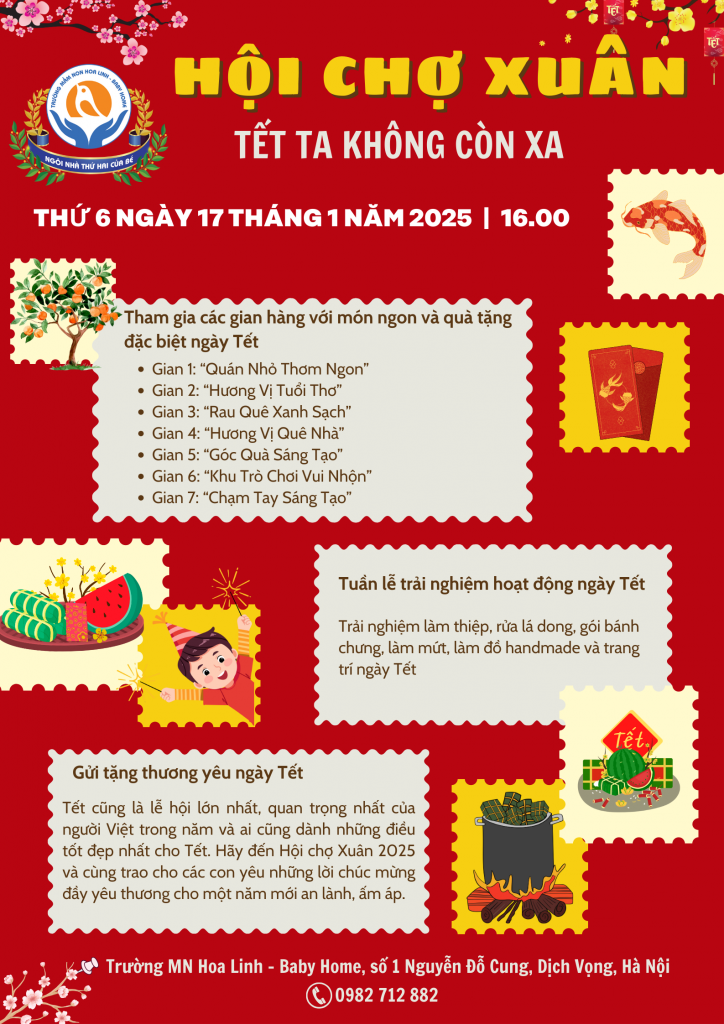 Nằm trong chuỗi hoạt động sôi nổi chào mừng xuân mới Ất Tỵ 2025, với mong muốn giúp các bé có thêm cơ hội trải nghiệm, tìm hiểu nét đẹp văn hoá dân gian, trường Mầm non Hoa Linh – Baby Home tổ chức “Hội chợ Xuân 2025” vào 16:00 thứ 6 ngày 17/01/2025. Đây […]