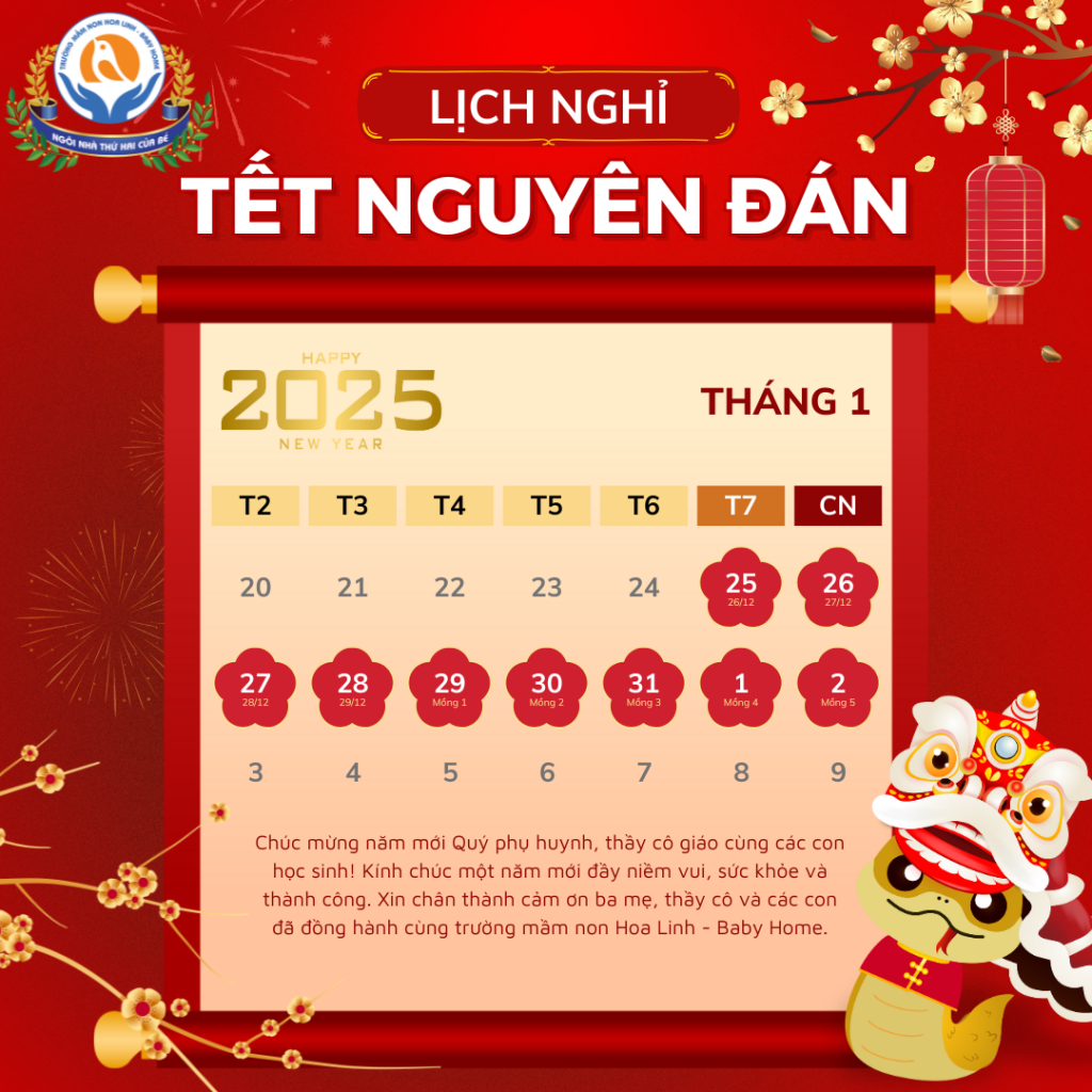 🎋 Hòa chung không khí hân hoan của những ngày cuối năm, trường mầm non Hoa Linh – Baby Home xin thông báo đến Quý phụ huynh và CBGVNV nhà trường lịch nghỉ Tết Nguyên Đán 2025 như sau: ⏱ Thời gian nghỉ: Từ ngày thứ 7, ngày 25/01/2025 (26/12 Âm lịch) 📌 Thời gian […]