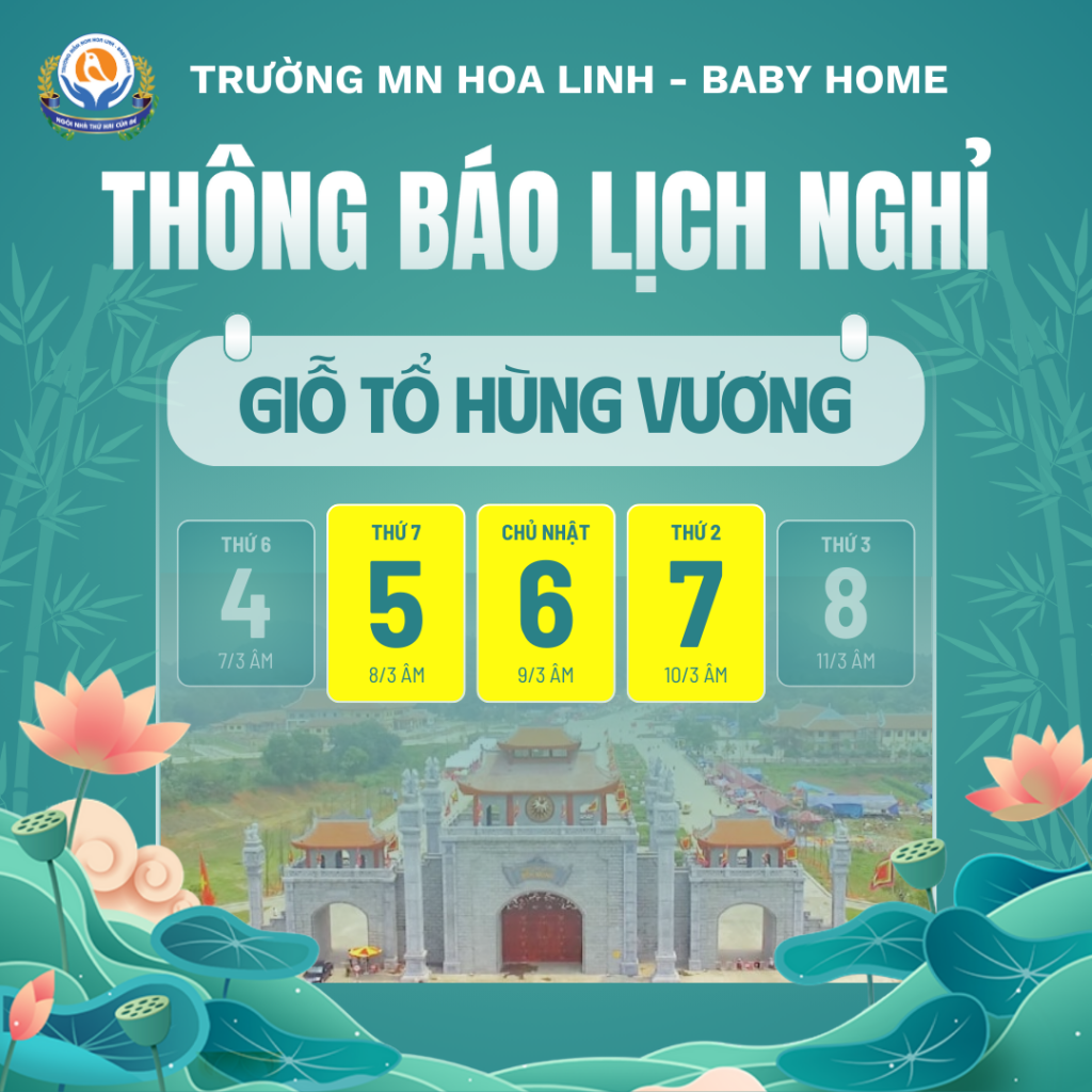 Kính gửi Quý phụ huynh, Trường Mầm non Hoa Linh – Baby Home xin thông báo lịch nghỉ lễ Giỗ Tổ Hùng Vương như sau: 🗓 Thời gian nghỉ: từ thứ Bảy, ngày 05/04 đến hết thứ Hai, ngày 07/04/2024 📌 Thời gian đi học lại: Các bé sẽ quay lại trường vào Thứ Ba, […]