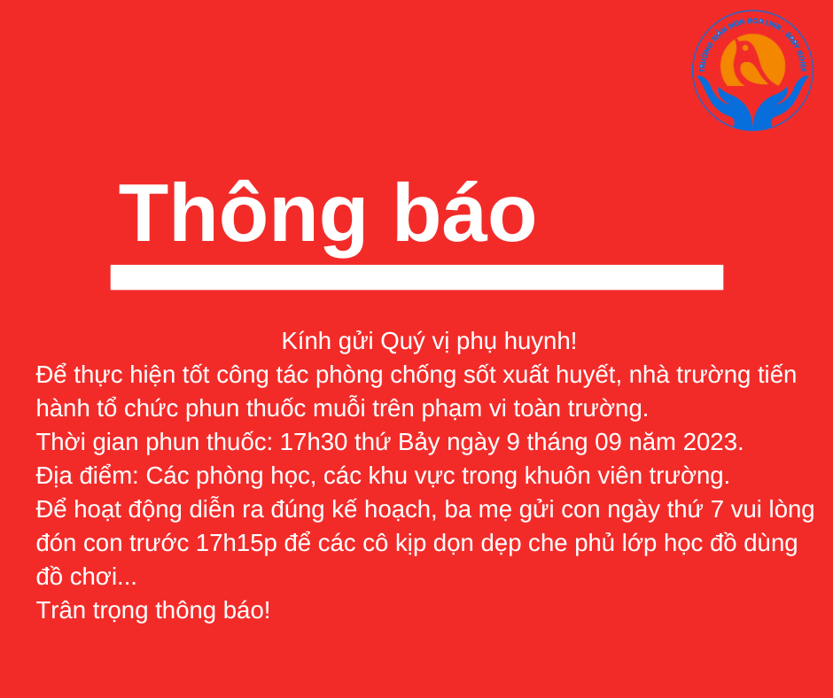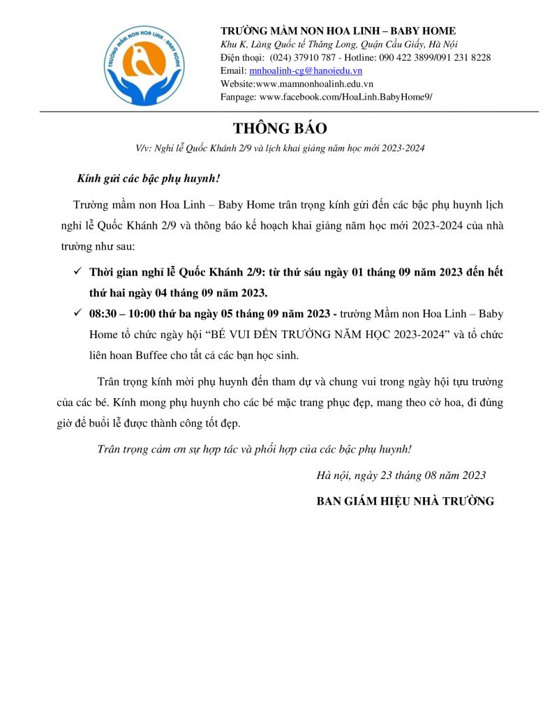 Kính gửi các bậc phụ huynh thông báo về ngày nghỉ lễ Quốc khánh 2/9/2023. Kính chúc các bậc phụ huynh cùng các con có ngày nghỉ lễ an toàn, sức khỏe và hạnh phúc. Nhà trường chào đón ba mẹ cùng các con trở lại vào ngày hội BÉ VUI ĐẾN TRƯỜNG để khai […]
