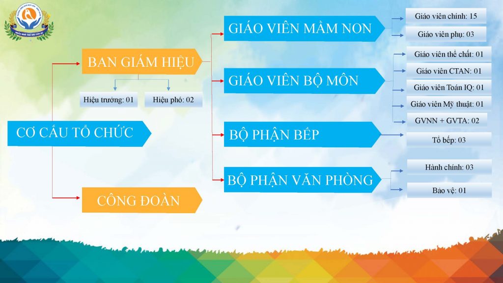 Tổng số nhân sự trong năm học 2023-2024 gần 40 người bao gồm giáo viên giảng dạy chuyên môn mầm non, giáo viên thể dục thể chất, giáo viên giảng dạy Tiếng Anh và kỹ năng, giáo viên giảng dạy bộ môn năng khiếu, tổ chuyên môn Tiếng Anh và cán bộ nhân viên văn phòng.
