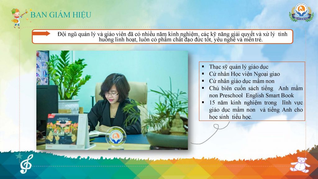 100% CBGVNV đều có trình độ chuẩn và trên chuẩn. Giáo viên nhà trường năng động, ứng dụng các phương pháp giảng dạy khoa học và kịp thời, yêu nghề mến trẻ. Bên cạnh đó giáo viên luôn tự bồi dưỡng học tập nâng cao kiến thức và những phương pháp giảng dạy tiên tiến áp dụng vào các giờ dạy. Nhà trường luôn tổ chức các chương trình bổi dưỡng chuyên môn để nâng cao nghiệp vụ; dự giờ, đánh giá rút kinh nghiệm về đổi mới phương pháp dạy học nhằm đem lại cho trẻ những giờ học thú vị.