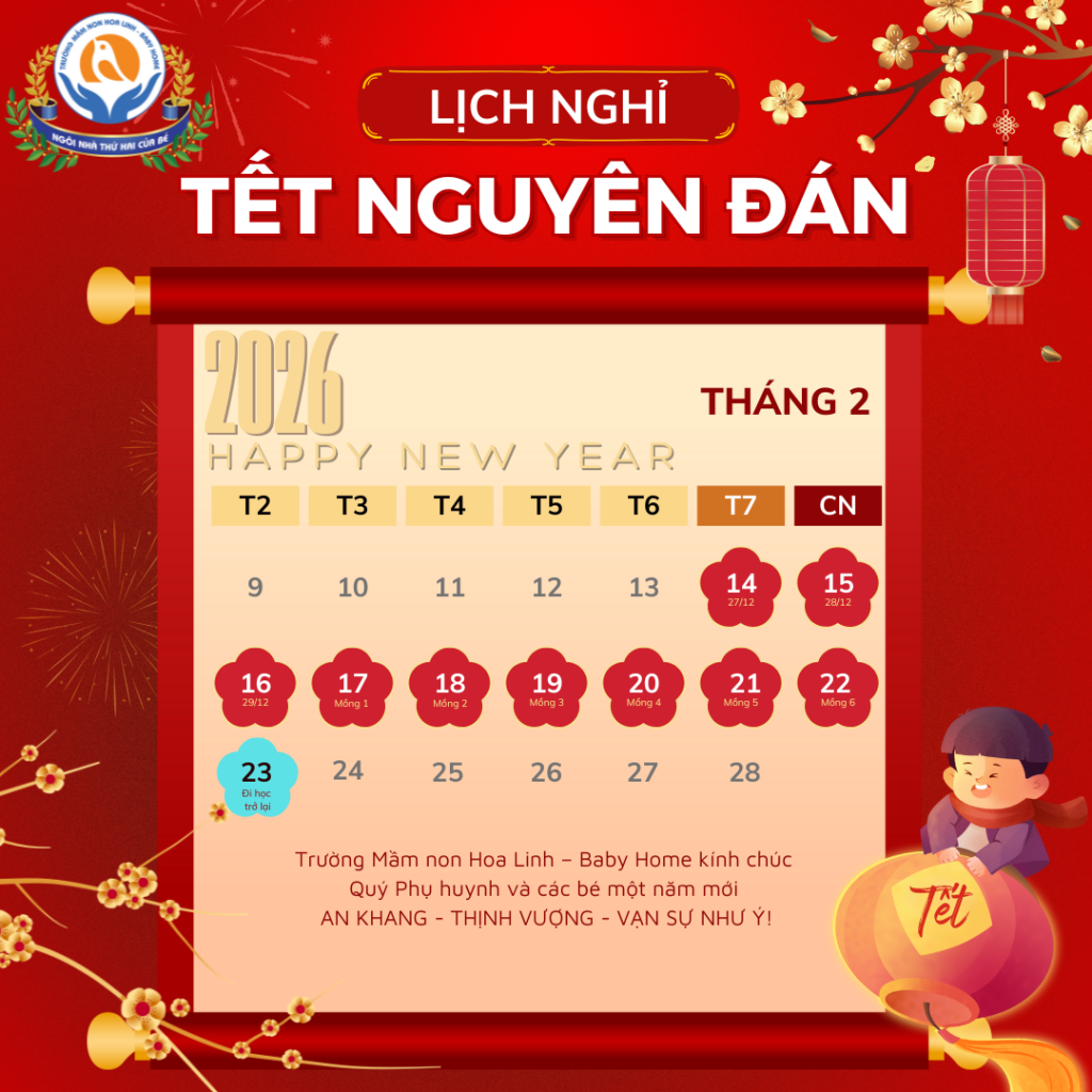 Nhà trường xin trân trọng thông báo đến Quý Phụ huynh lịch nghỉ Tết Nguyên Đán năm 2026 của trường như sau: