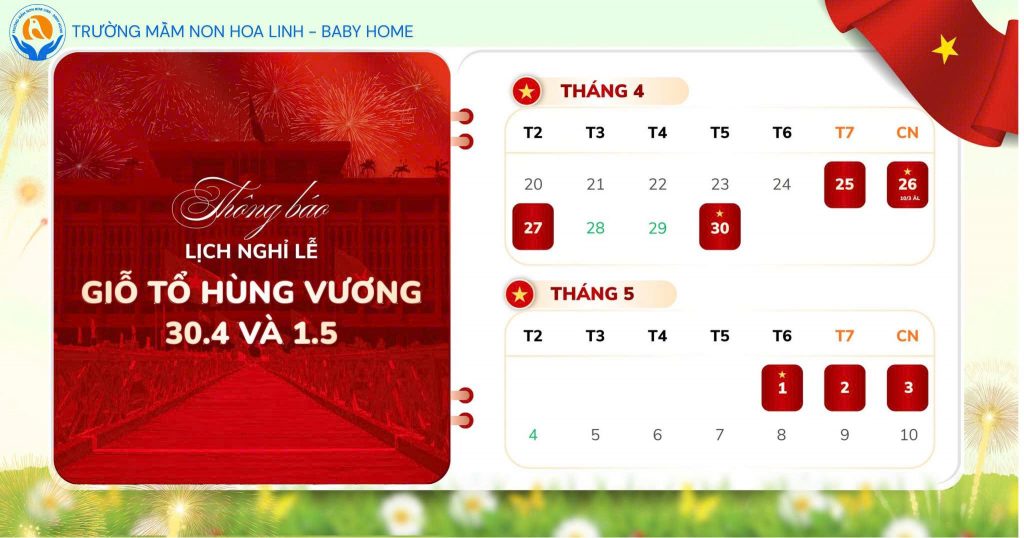 Để Quý Phụ huynh cùng gia đình có thể sắp xếp kế hoạch cho kỳ nghỉ lễ Giỗ tổ Hùng Vương, Giải phóng miền Nam – thống nhất Đất Nước 30/4 và ngày Quốc tế lao động 1/5, trường mầm non Hoa Linh – Baby Home xin thông báo lịch nghỉ lễ dành cho các con như sau: